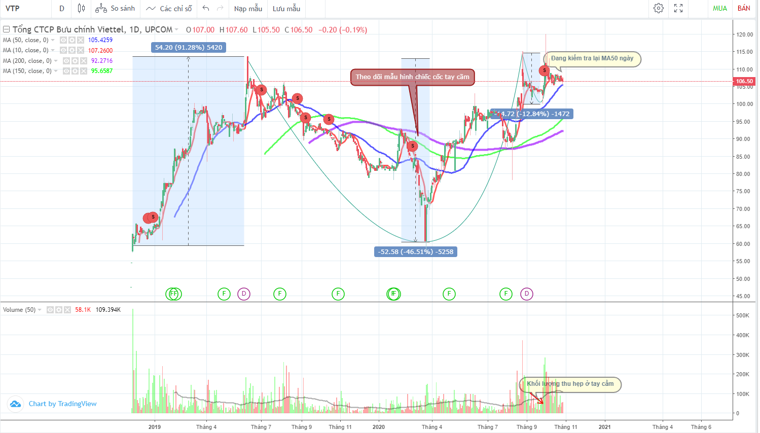 VTP đang hình hành mẫu hình Chiếc Cốc-Tay Cầm Lớn cần phải theo dõi. Hiện nay giá đang kiểm tra lại MA50 ngày.