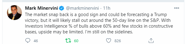 Cú hồi của thị trường là tín hiệu tốt và có thể dự báo Trump chiến thắng nhưng nó chắc chắn bị cản bởi MA50 ngày. Với điều tra Investors Intelligence cho thấy 60% phía bull và chỉ vài cổ phiếu có nền giá kiến tạo, khả năng upside là thấp. Tôi tiếp tục đứng ngoài.