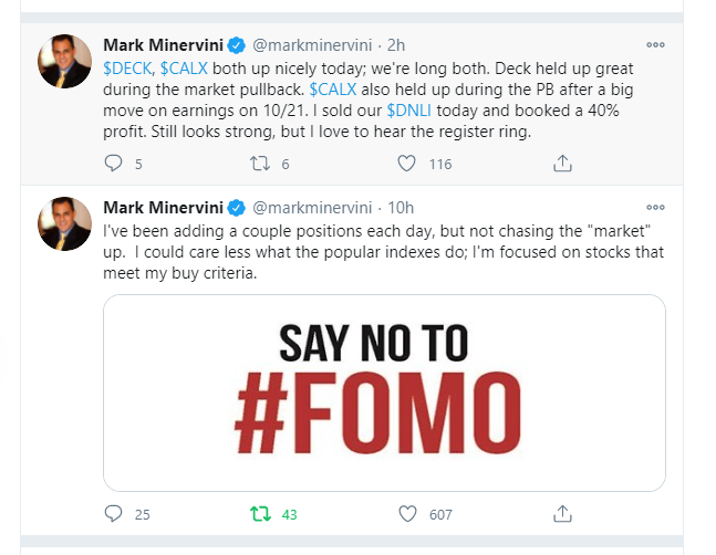 Mặc dù triển vọng thị trường đã được Nhật Báo IBD đánh giá tích cực nhưng phù thủy Mark Minervini tỏ ra thận trọng trong việc giải ngân. Ông muốn tránh né FOMO (sợ bỏ lỡ cơ hội). Mark bổ sung vị thể là DECK và CALX. Mark từ tốn giải ngân các mã cổ phiếu đáp ứng tiêu chí mua hơn là quan sát chỉ số thị trường chung.