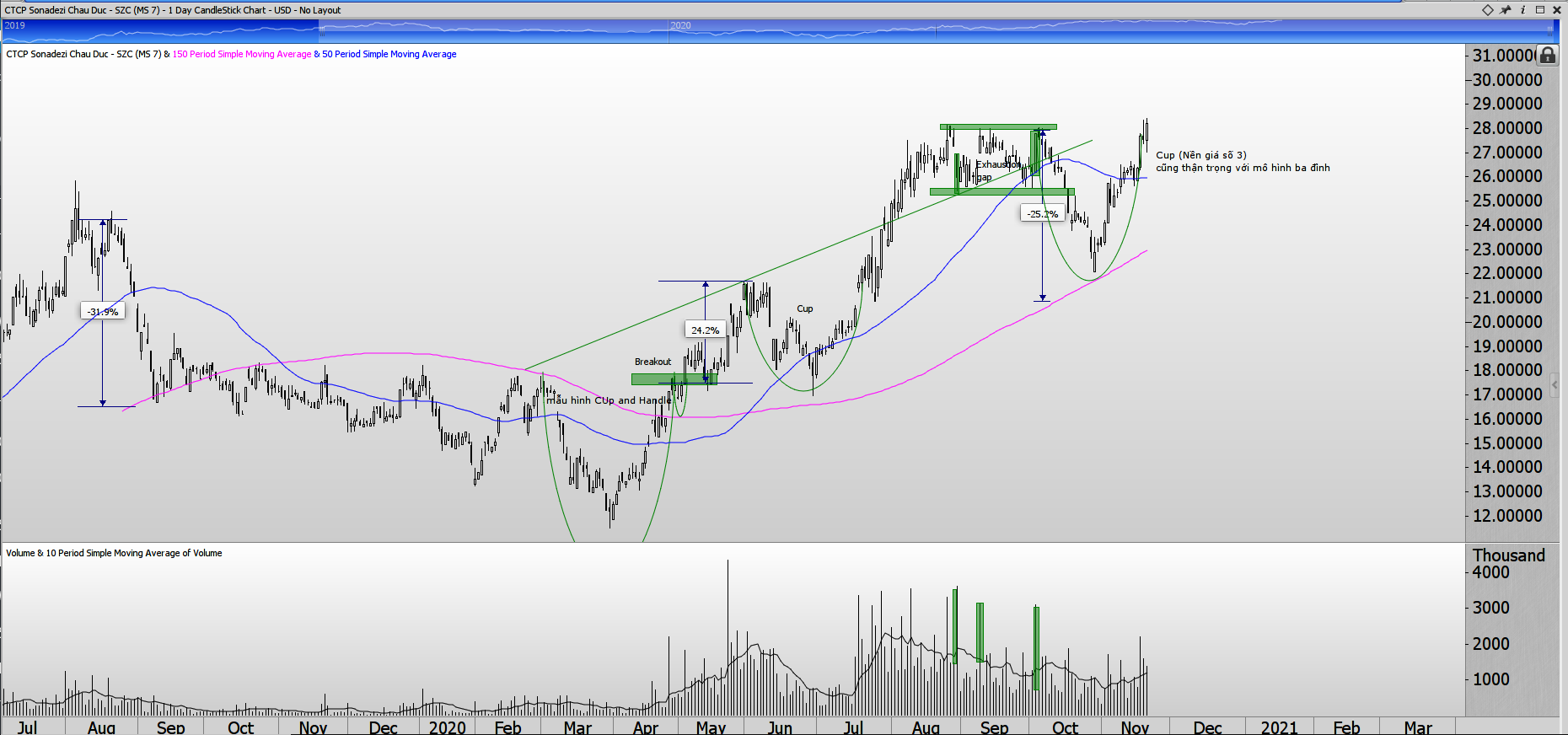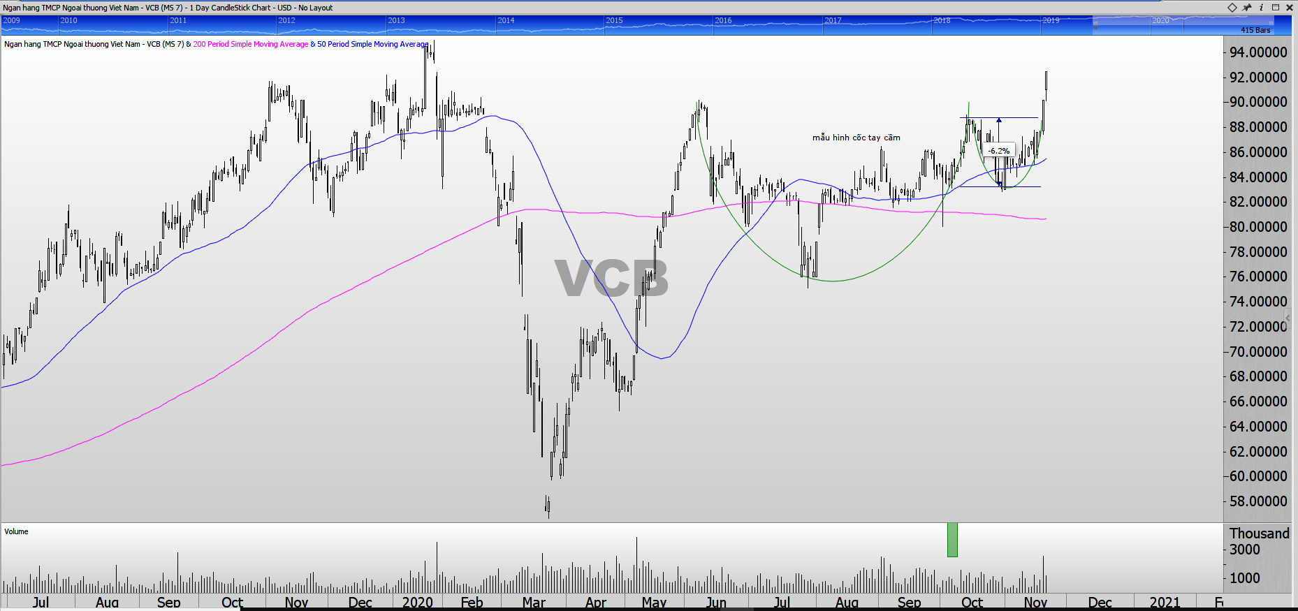 Khi rơi vào khung giá rộng, các mẫu hình hay nền giá sẽ trở nên lỏng. Tôi phát hiện một số cổ phiếu chủ chốt trở nên bị lỏng ở phần tay cầm như VCB. Các mẫu hình cốc tay cầm tốt nên có tay cầm nằm trên MA50. Nhưng VCB đang kiểm tra test lại MA50 ngày.