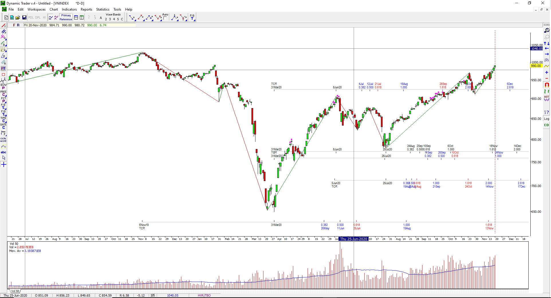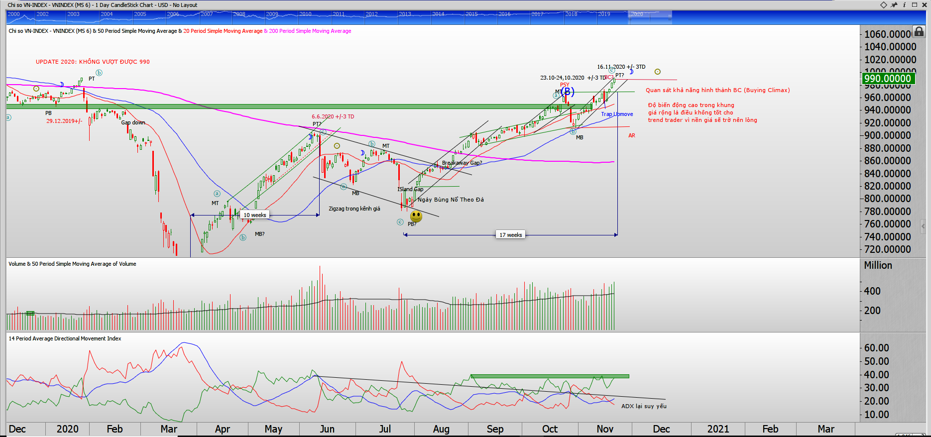 Chúng tôi có sự điều chỉnh trong việc theo dõi mẫu hình Wyckoff. Theo đó đỉnh ngày 26/10/2020 được theo dõi như là PSY còn hiện tại thị trường đang có khả năng quan sát đỉnh BC (Buying Climax), hay mua cao trào. Mua cao trào thường xuất hiện trong một uptrend, khi giá được chi phối bởi tin tốt và các hành vi mua bất hợp lý sẽ đẩy giá tăng cao. PSY và BC thuộc pha A của Wyckoff. Thật khó để suy xét chính xác hiện tại có phải là BC hay không nhưng quan sát của chúng tôi về chỉ báo ADX đang thấy kiểu ADXhaustion, tức giá thiết lập đỉnh cao mới nhưng từ tháng 9 đến nay, ADX không thiết lập đỉnh cao mới mà giảm dần về dưới 25. +DMI bị kháng cự liên tục.