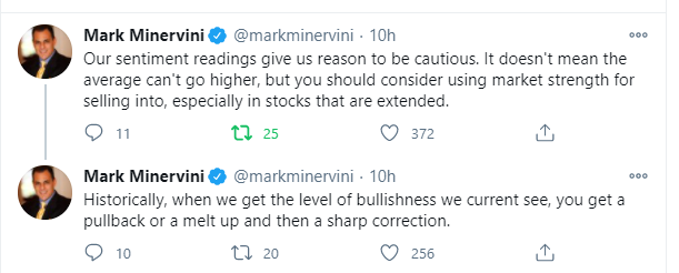 Phù thủy Mark Minervini lo ngại sentiment (chỉ báo tâm lý thị trường). Điều này không có nghĩa chỉ số thị trường không tăng lên cao hơn mà bạn nên xem xét việc chốt lãi khi giá đang tăng, đặc biệt là các cổ phiếu đã tăng kéo dài. Trong lịch sử, khi chúng ta có mức lạc quan như hiện tại, một đợt pullback (kéo ngược) xuất hiện và sau đó rớt nhanh.