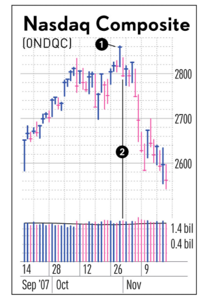 Thị trường có một giai đoạn tăng giá mạnh mẽ từ giữa tháng 8 đến cuối tháng 10 năm 2007. Hành động giá vào ngày 31 tháng 10 năm 2007 là mấu chốt. Nasdas có một ngày tăng giá rất hoàn hảo, tăng tới 1.5% với giá đóng cửa nằm ở đỉnh cao nhất ngày đi kèm với vol lớn hơn (đánh số 1). Đây là điểm đánh dấu đỉnh cao nhiều năm. Thậm chí với một nhà đọc đồ thị khó tính cũng đánh dấu đây là mức điểm cao nhất A+ cho chất lượng hành động giá. Điều này để bạn hiểu rằng thị trường đang “kỳ vọng” chỉ số sẽ tiếp tục tăng cao nhiều hơn nữa.