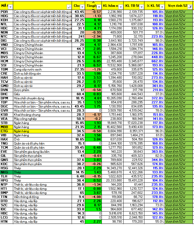Theo dữ liệu thống kê của VFA, hôm nay thị trường có 52 mã vượt đỉnh 52 tuần và 1 mã phá thủng đáy 52 tuần. Sóng ngành đang tập trung ở các nhóm ngành Bất động sản, Công ty chứng khoán, Ngân hàng, dịch vụ vận tải (cảng biển), các nhóm công nghiệp cơ bản như cao su, thép