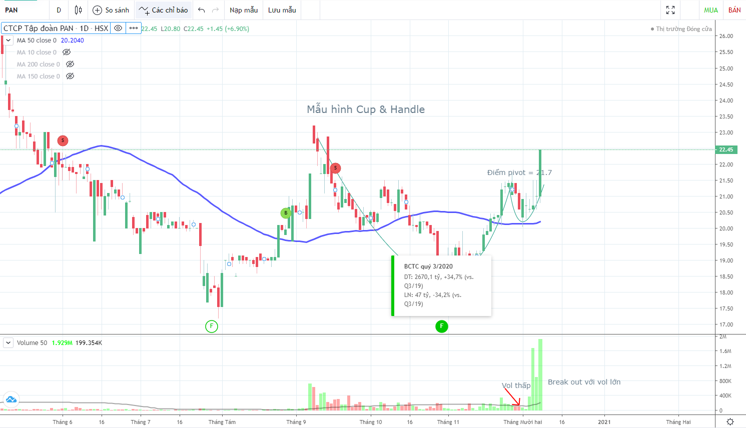 Cổ phiếu PAN : hôm nay cổ phiếu PAN có điểm Breakout của mô hình Cup&Handle tại nền giá số 1.