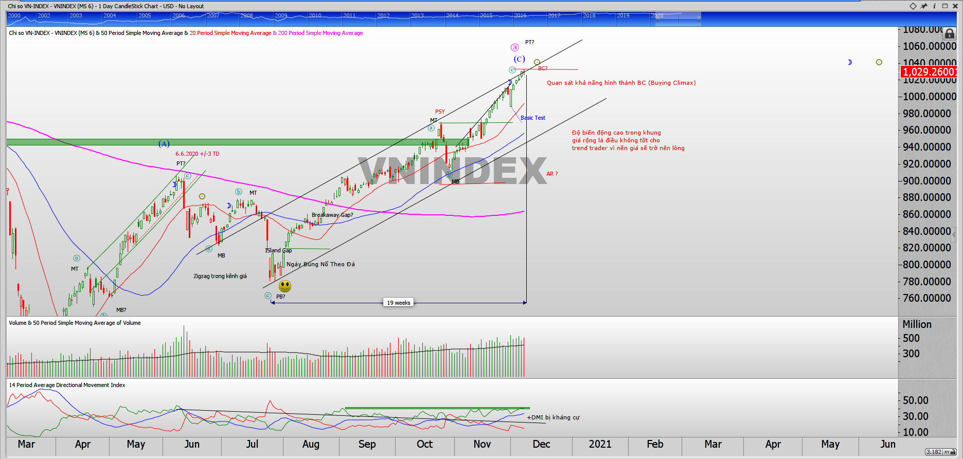 Chỉ số Vnindex vẫn đang bị kháng cự bởi đường xu hướng trên của kênh giá, chúng tôi vẫn đang theo dõi khả năng tạo BC (Buying Climax) trong mô hình Wyckoff.