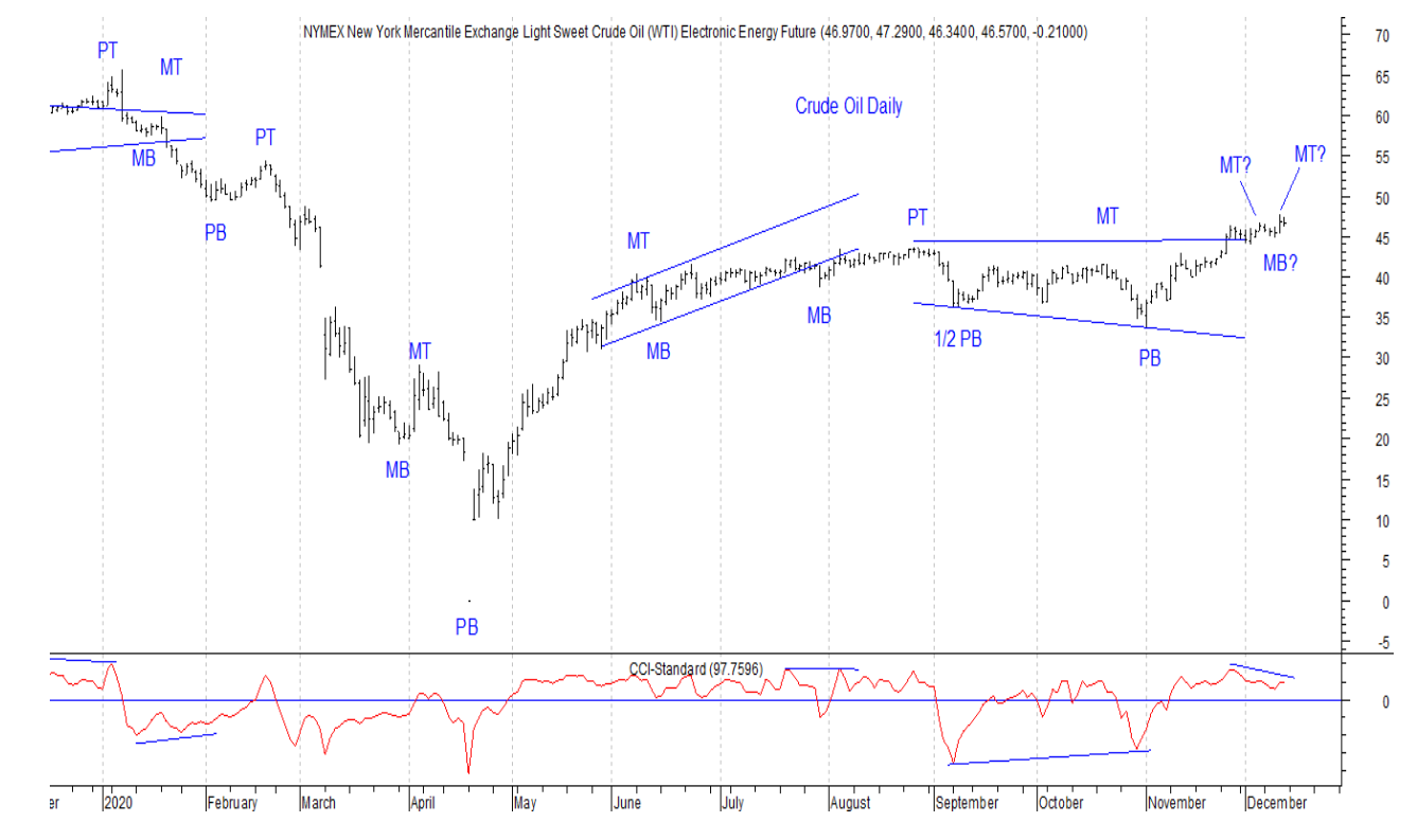 Tuần bắt đầu ngày 14/12/2020 là tuần thứ 6 kể từ đáy chu kỳ sơ cấp PB vào ngày 2/11/2020 tại mức giá 33.64. Giá hiện nay đã vượt đỉnh PT của chu kỳ sơ cấp trước đó cho thấy một dấu hiệu bullish. Chúng tôi theo dõi việc khả năng tạo đáy MB đầu tiên, thường chỉ giảm 3-8 ngày kể từ MT đầu tiên, và hiện nay đang tăng giá hướng đến MT thứ hai.