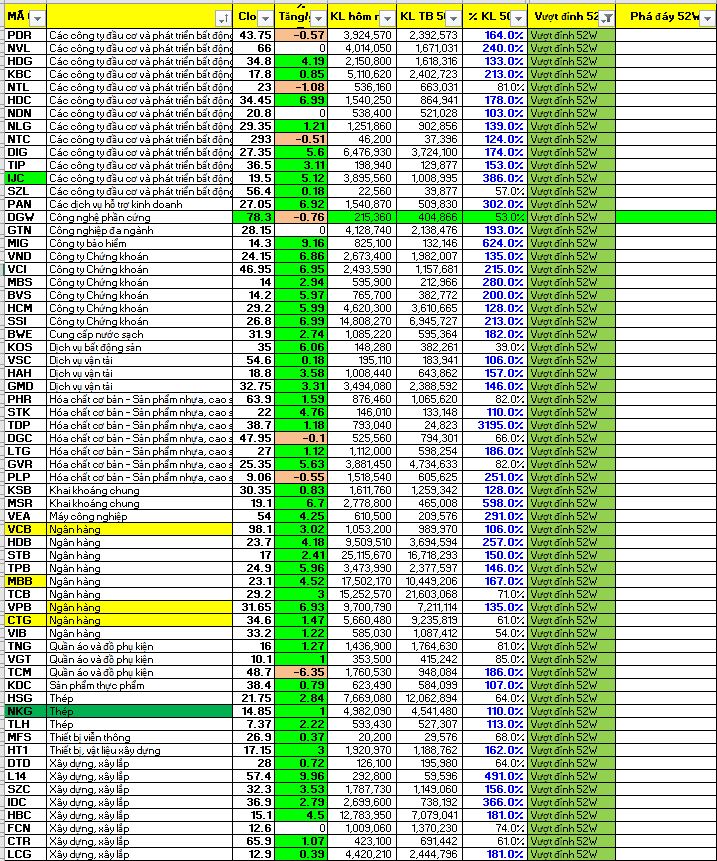 Theo thống kê của VFA, có 169 cổ phiếu với giá đóng cửa nằm cao hơn MA50 ngày và 179 cổ phiếu với giá đóng cửa nằm trên MA100 ngày. Ngoài ra có 64 cổ phiếu đang vượt đỉnh 52 tuần trong phiên ngày hôm nay. Nhóm ngành dẫn dắt : ngân hàng, chứng khoán, bất động sản, xây dựng ….