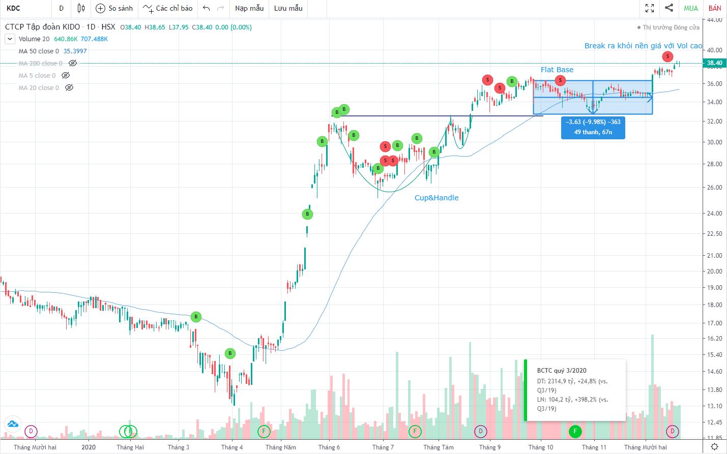 KDC xuất hiện mẫu hình nền giá phẳng chồng lên mẫu hình tách và tay cầm. KDC đang ở nền giá số 2. Cây nến breakout thoát khỏi nền giá phẳng với khối lượng lớn đồng thời là điểm mua Pocket Pivot.