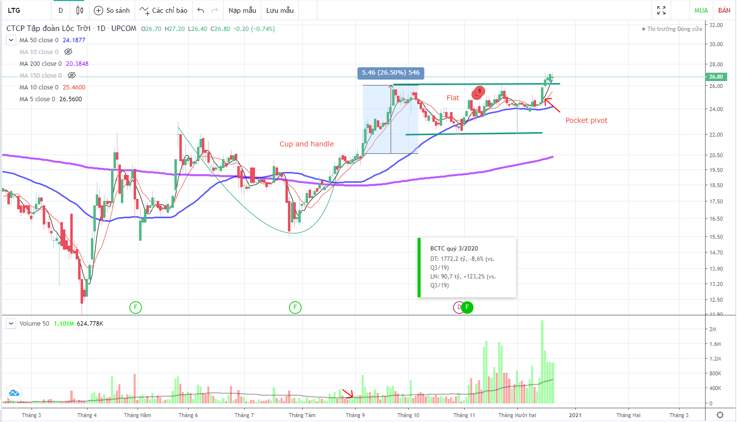LTG đã có điểm breakout thoát khỏi nền giá phẳng. Đây là nền giá số 2. Phiên giao dịch ngày hôm nay LTG tiếp tục có phiên Pocket Pivot. Trước đó, LTG cũng đã có điểm pocket pivot để mua sớm trong nền giá vào ngày 15/12/2020. (xem thêm ở cuốn sách “Cách Kiếm Lợi Nhuận 18000% từ thị trường chứng khoán).