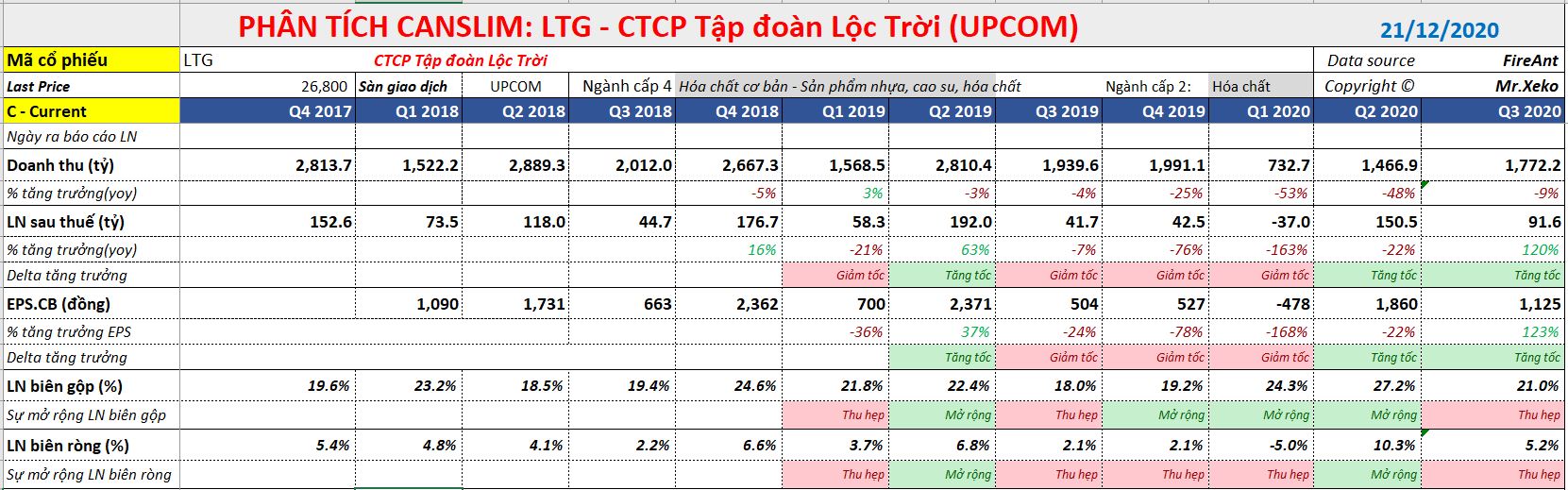 Doanh thu quý III năm 2020 của LTG giảm 8.6% so với cùng kỳ, chỉ đạt gần 1,772 tỷ. Tuy nhiên, lợi nhuận sau thuế quý III lại tăng trưởng hơn 120% so với cùng kỳ, đạt 91 tỷ. Lợi nhuận của LTG cải thiện trong hai quý gần đây nhờ biên lợi nhuận gộp được tăng lên và cắt giảm chi phí thành công. Xem lại bản phân tích CANSLIM về LTG tại đây.