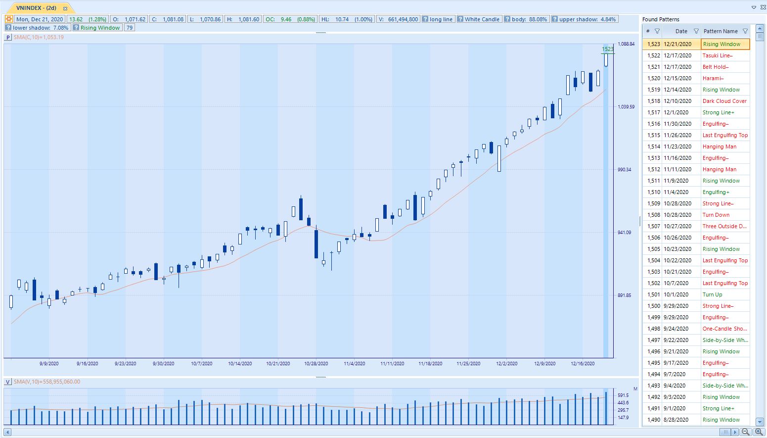 Phân tích hành động giá dưới góc nhìn nến Nhật Bản, Vnindex xuất hiện mẫu hình Rising Window, đây là một mẫu hình tiếp diễn với khoảng trống (Gap) tăng giá. Trong bài viết trước chúng tôi, đã đánh giá mô hình Tasuki Line mang tính trung lập nên phiên hôm nay là sự khẳng định của phe mua khi tiếp tục đẩy Vnindex tăng giá cao hơn nữa. Cách thức sử dụng mẫu hình này chúng ta có thể xem xét khoảng trổng giá là một ngưỡng hỗ trợ cho Vnindex. Chúng tôi cũng đang cân nhắc khả năng ngày mai thị trường có thể giảm nhẹ với một thân nến đen và đi sâu vào khoảng trống giá tạo nên mô hình tiếp diễn Upside Gap Tasuki.