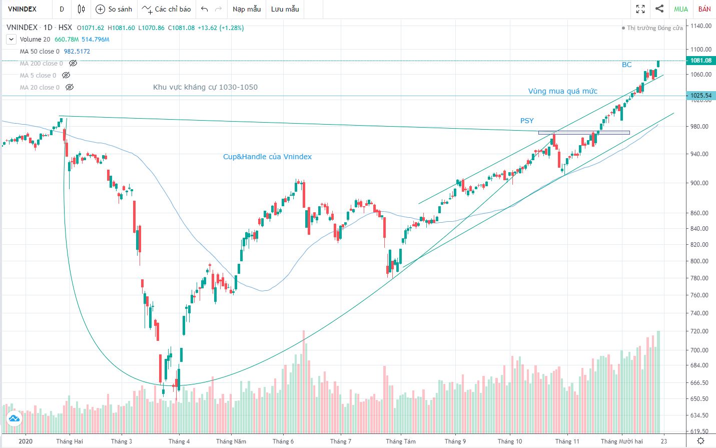 VFA tiến hành xóa ngày phân phối ngày 10/12 khi VN-Index tăng cao hơn 5% so với giá đóng cửa phiên phân phối này. Như vậy, thị trường chỉ còn 2 ngày phân phối là ngày 15/12 và ngày 17/12. Theo quy tắc của hệ thống Canslim, với 2 phiên phối phối thì xu hướng tăng cho thị trường vẫn đang duy trì tốt, chúng ta không nên làm gì; có thể tiến hành mua mới nếu cổ phiếu xuất hiện tín hiệu từ những nền giá đẹp.