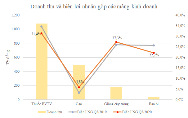 Trong quý III, biên lợi nhuận gộp mảng gạo tăng từ 3.3% lên 5,8%, mảng hạt giống từ 26% lên mức 27.3%. Tuy nhiên, biên lợi nhuân gộp từ mảng có doanh thu cao nhất là thuốc bảo vệ thực vật là thu hẹp từ 34.6% xuống còn 31.4%.