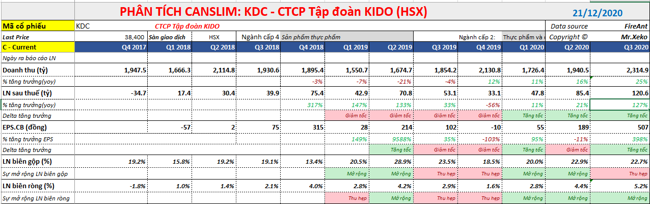 Kết quả kinh doanh quý 3/2020 của KDC rấ ấn tượng với mức tăng trưởng lợi nhuận sau thuế hơn 127%. KDC đang có cấu trúc Code 33 của phù thủy Mark Minervini khi tăng trưởng doanh số và lợi nhuận đang tăng tốc, lợi nhuận biên được mở rộng trong 3 quý gần đây. (Vui lòng tìm hiểu Code 33 tại cuốn sách Giao Dịch Như Một Phù Thủy Chứng Khoán).
