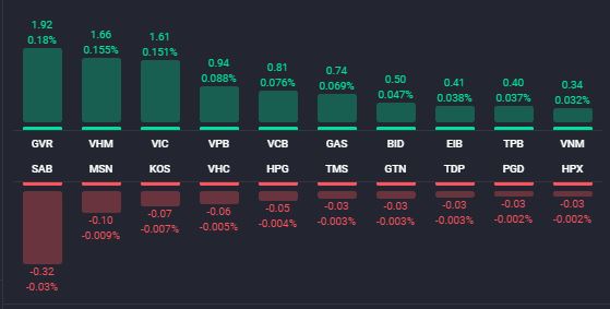Trong phiên giao địch đầu tuần, chỉ số Vnindex khởi đầu tích cực nhờ sự tăng điểm của các cổ phiếu ngành ngân hàng và chứng khoán như VND, SSI, TPB, VPB, HDB, SHB … Càng về cuối phiên giao dich, đà tăng giá của hai nhóm ngành chứng khoán và ngân hàng càng mạnh mẽ. Các cổ phiếu SSI, VND, VCI, CTS, VPB, EIB và TPB được kéo lên giá trần hoặc sát trần. Ở nhóm hóa chất, GVR tiếp tục chuỗi ngày tăng điểm bằng việc đóng cửa ở mức giá trần 27.1. Bên cạnh đó, sự hỗ trợ của các mã vốn hóa lớn cũng đã góp phần tác động tích cực đến thị trường như VHM, VIC, VCB và GAS…