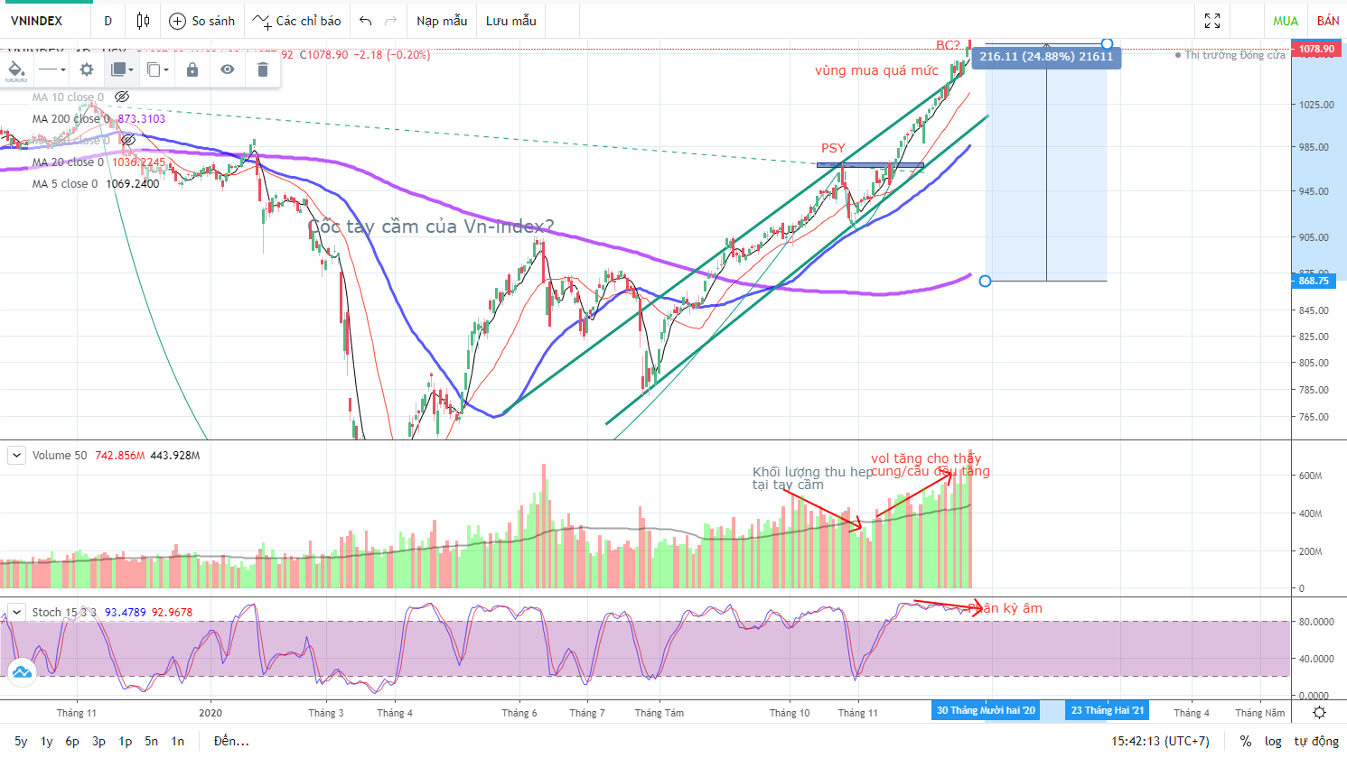 Trong mô hình Wyckoff, chúng tôi đã cảnh báo về sự không hài hòa trong hành động giá ngày hôm qua (khối lượng lớn nhưng spread giá hẹp). Chúng tôi đang theo dõi sự kiện BC (Mua Cao Trào) tiềm năng khi giá đã vượt ra khỏi đường cung tạo nên tình trạng mua quá mức. Sự phân kỳ giữa giá và chỉ báo Stochastic Oscilator lại tái xuất hiện. Lưu ý, sự kiện BC chưa được xác nhận cho đến xảy ra sự kiện AR (Điều Chỉnh Kỹ Thuật). Chúng tôi thường quan sát MA5 ngày cắt xuống MA20 ngày để xác nhận cho hành động giá này.