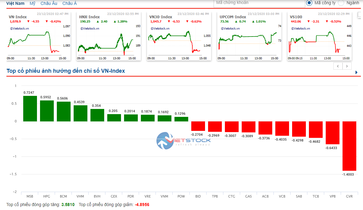 Chỉ số VN-Index tăng điểm khá ấn tượng trong suốt phần lớn phiên giao dịch. Tuy nhiên, bên bán bắt đầu chốt lời ở phiên giao dịch buổi chiều khiến chỉ số VN-Index giảm điểm. Theo đó, VN-Index đóng cửa tại mức 1078.9, tương ứng giảm -0.42%. Khối lượng tăng cao hơn phiên hôm trước và tạo nên ngày phân phối. Giá đóng cửa nằm ở đáy thấp nhất ngày tạo nên hành động giá tiêu cực. Như vậy, chỉ số VN-Index trở lại có 3 ngày phân phối. Các cổ phiếu dẫn dắt thị trường trong thời gian gần đây lần lượt bị bán mạnh như GVR, VPB, TCB, VCB, ACB, CTG….(phần lớn đều thuộc nhóm cổ phiếu ngân hàng).
