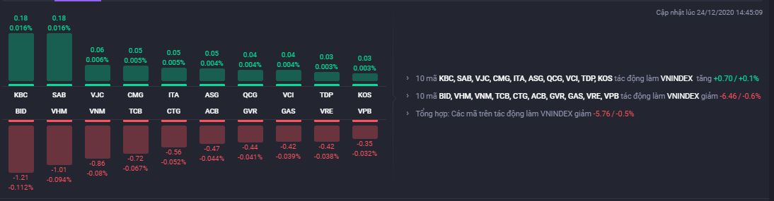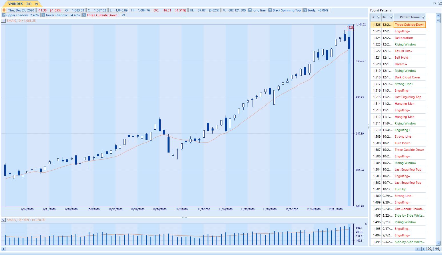 Thị trường bắt đầu phiên giao dịch ngày 24/12 với không ít lo lắng về rủi ro thanh khoản của hệ thống giao dịch tại HOSE. Chỉ sau 50 phút giao dịch đầu tiên, khối lượng giao dịch đã lên mức kỷ lục gần 200 triệu cổ phiếu. Hiện tượng xử lý chậm dẫn đến nhiều mã xảy ra tình trang giá đỏ dù dư mua và dư bán vẫn đang xanh, tiêu biểu như VHM. Kết thúc phiên sáng, Vnindex đã giảm 15 điểm, tương đương với mức giảm 1.5%. Thanh khoản thị trường ở mức kỷ lục với gần 900 triệu cổ phiếu được trao tay. Diễn biến phiên chiều vẫn không có gì khả quan hơn, thị trường giao dịch với trạng thái chậm. Đóng cửa phiên giao dịch ngày hôm nay, Vnindex giảm 11.38 điểm (-1.05%) xuống còn 1067 điểm.