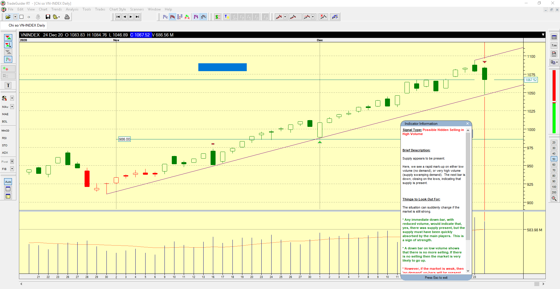 Theo góc nhìn VSA, hành động giá phiên hôm nay gọi là “Possible Hidden Selling in High Volume”. Đó là thanh giá tăng hoặc có giá đóng cửa nằm ở nửa trên khung giá với khối lượng lớn. Sau một giai đoạn tăng giá, thì sự xuất hiện của hành động giá này cho thấy bắt đầu có sự phân phối của một hoặc nhiều nhóm nhà giao dịch chuyên nghiệp. Nếu trong những ngày tiếp theo, tiếp tục là thanh giá giảm đóng cửa ở gần đáy thấp ngày sẽ xác nhận dấu hiệu yếu (SOW) này. Hoặc nếu xuất hiện thanh giá tăng với khối lượng lớn nhưng spread hẹp cũng cho thấy còn áp lực bán. No Demand hoặc Upthrust cũng xác nhận SOW và tạo ra bức tranh tiêu cực.