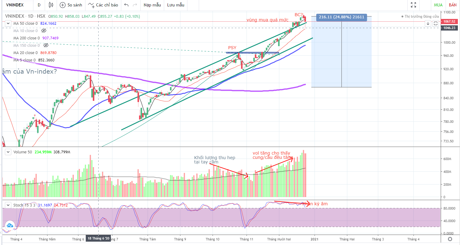 Trong mô hình Wyckoff, chúng tôi theo dõi khả năng xuất hiện BC (Cao Trào) tiềm năng khi giá đã rơi vào tình trạng mua quá mức. Các dấu hiệu phân kỳ giữa giá và chỉ báo stochastic Oscillator cũng như vượt ra ngoài đường cung đang phản ánh tình trạng mua quá đà này.