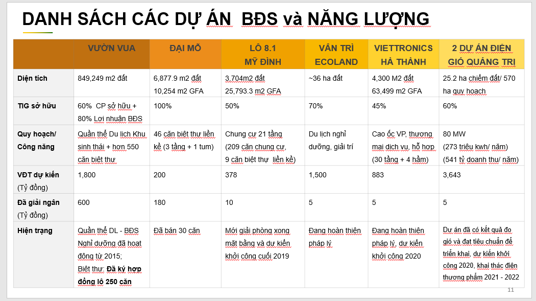 Chất xúc tác chính cho động lực tăng trưởng của TIG là dự án Vườn Vua Resort & Villa tại xã Đồng Trung, huyên Thanh Thủy, tỉnh Phú Thọ. Diện tích dự án là 828,976m2 được xây dựng từ năm 2013 đến nay, bao gồm công viên vui chơi giải trí ngoài trời và hệ thống biệt thự nghỉ dưỡng hơn 500 căn biệt thự, nhà vườn sinh thái. Tổng mức đầu tư dự án là 1,452 tỷ đồng. Dự án đang được mở rộng thêm 20-30 ha. TIG đang tiến gần đến điểm rơi lợi nhuận từ dự án này.