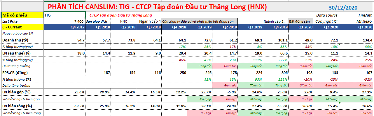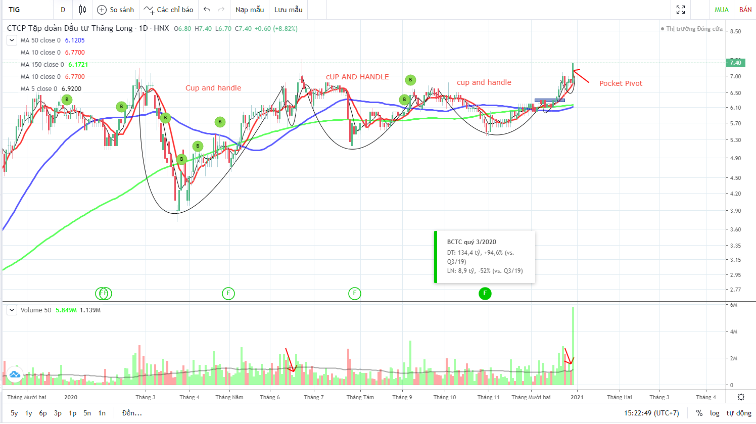 Sau hai lần tạo mẫu hình Cup and handle thất bại, đến ngày 21/12/2020, TIG mới tạo nên mẫu hình Cup and handle lần thứ ba thành công. Ngày 30/12/2020, TIG có tiếp điểm mua Pocket Pivot tiếp diễn của Môn Đệ O’Neil. Đây là nền giá số 1 của TIG.
