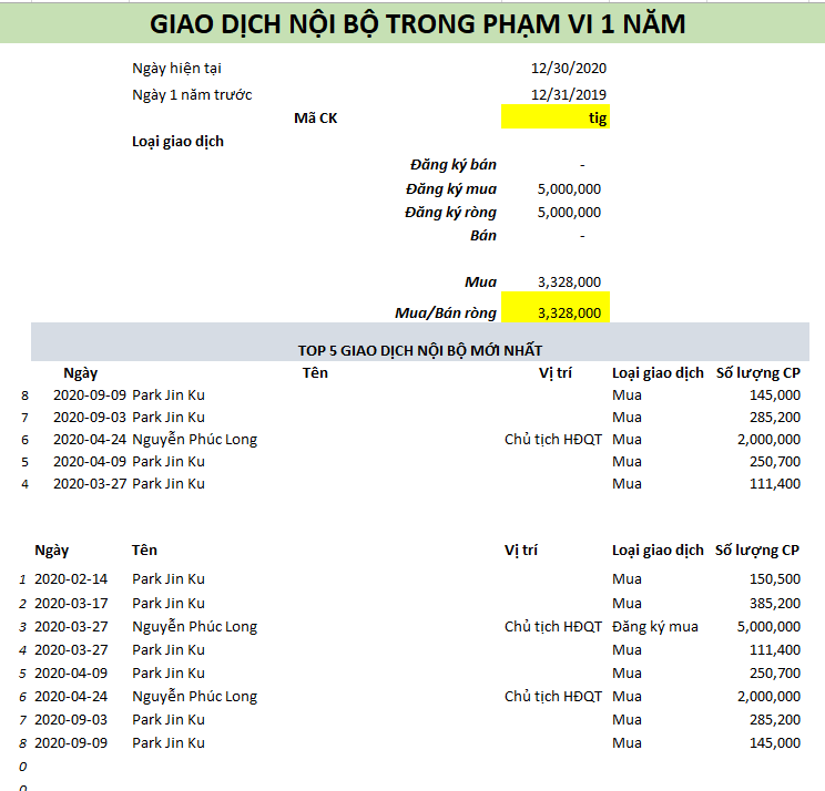 Trong mô hình CANSLIM, TIG đáp ứng được chữ I khi có các nhà đầu tư nội bộ mua vào. Theo đó, chủ tịch Nguyễn Phúc Long mua vào 5 triệu cổ phiếu hồi tháng 3 và thời gian qua ông Park Jin Ku liên tục mua vào.
