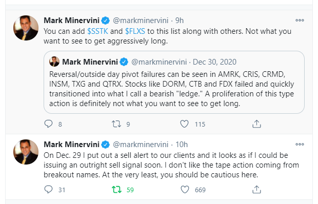 Phù thủy Mark Minervini vào ngày 29/12 đã gửi thông điệp bán cho các khách hàng và tiến hành khóa lợi nhuận. “Tôi không thích hành động giá breakout từ một số cổ phiếu. Ít nhất vào lúc này, bạn nên có sự thận trọng”.