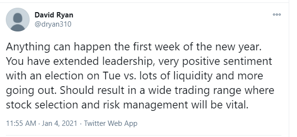 Phù Thủy David Ryan thì mãi 4 tháng mới thấy dòng twitter. Ông ít khi xuất hiện trên mạng xã hội. Lần này ông vẫn duy trì thông điệp thận trọng. “Bất cứ điều gì cũng có thể xảy ra vào tuần đầu tiên của năm mới. Bạn đã có nhiều cổ phiếu dẫn dắt bị tăng giá kéo dài, và Sentiment thị trường chung rất lạc quan. Kết quả bầu cử có thể xuất hiện vào ngày thứ ba với thanh khoản thị trường ở mức cao. Điều này dẫn tới nhiều cổ phiếu đang có khung giá rộng và lúc này việc quản trị rủi ro là vấn đề sống còn”.