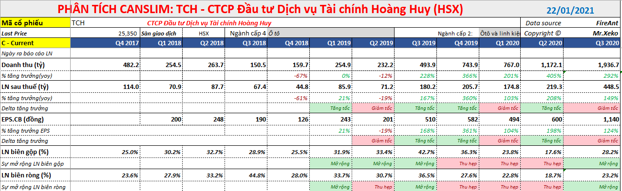 TCH đã có 3 quý liên tiếp có sự tăng tốc về tăng trưởng doanh thu, lợi nhuận bên cạnh sự mở rộng của biên lợi nhuận để tạo nên mẫu hình Code 33 của phù thủy Mark Minervini : (xem sách Giao dịch như một phù thủy Chứng khoán).