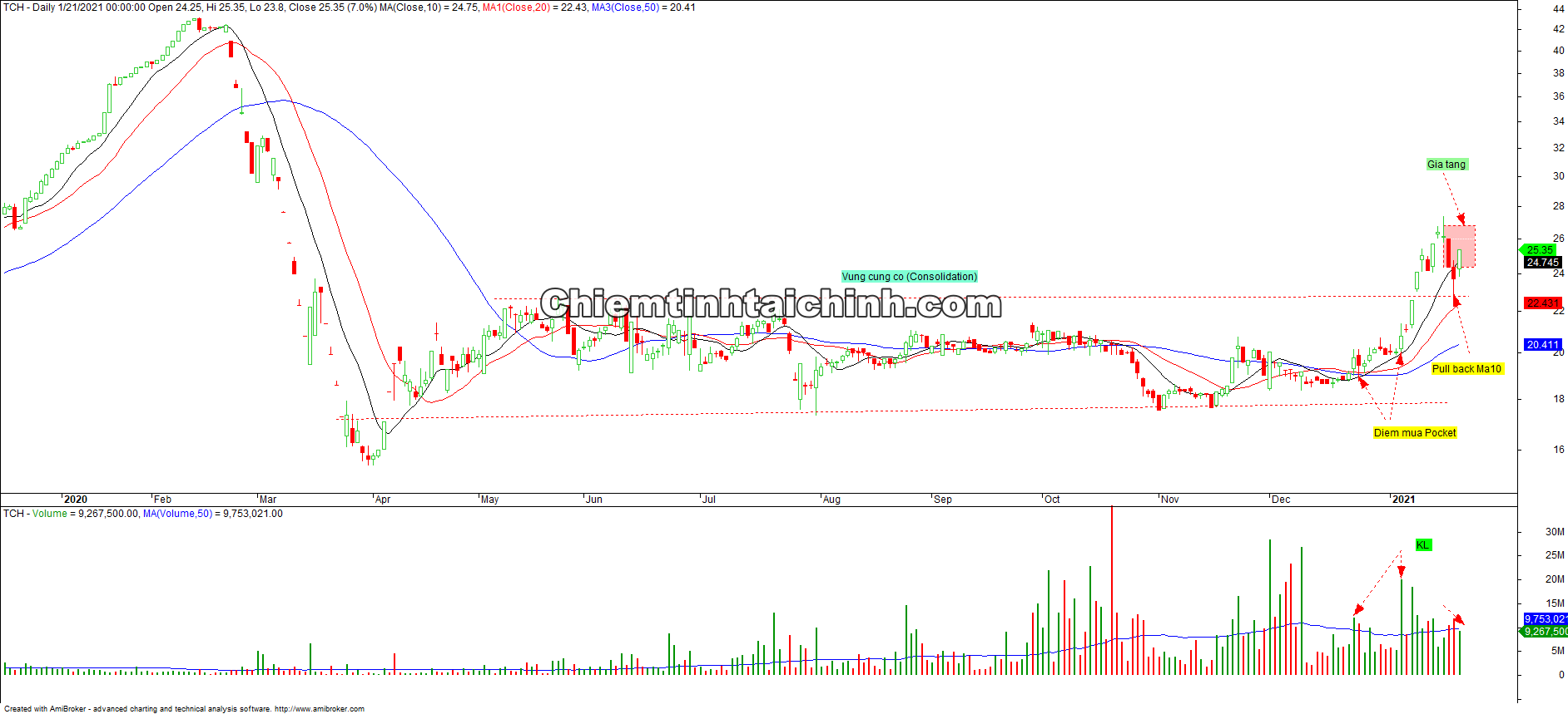 – Cổ phiếu TCH đã breakout ra khỏi “vùng củng cố (consolidation)” , hành động giá kéo ngược lại MA10 ngày ở vùng 24 có thể nơi giải ngân vị thế đối với TCH. Trước đó TCH đã có những điểm mua sớm về Pocket trong nền giá ở các vùng 18-20K.