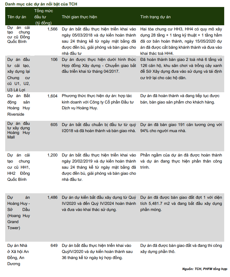 Dự án Hoàng Huy Riverside, Hoàng Huy Mall (Hải Phòng), Gold Tower (Hà Nội) đã hoàn tất công tác bán hàng. TCH đang trong quá trình đầu tư thi công dự án nhà ở xã hội An Đồng (Hải Phòng) và Hoang Huy Grand Tower 37 tầng và chuẩn bị khởi công cụm 5 toà chung cư cao tầng thuộc dự án Hoàng Huy Commerce. Công ty cũng đang tiếp xây dựng cặp chung cư HH1, HH2 Đồng Quốc Bình là dự án cải tạo chung cư cũ tại TP. Hải Phòng.