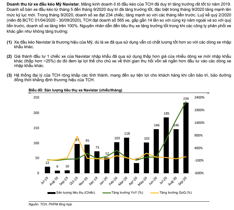 Mảng kinh doanh đầu kéo: đang có xu hướng tăng mạnh kể từ tháng 7 năm 2020. Theo báo cáo phân tích tổng hợp của Công ty Cổ phần Chứng khoán Phú Hưng – PHS, mảng kinh doanh ô tô đầu kéo của TCH đã duy trì tăng trưởng rất tốt từ năm 2019. Doanh số bán xe đầu kéo từ tháng 5 đến tháng 9/2020 duy trì đà tăng trưởng tốt, đặc biệt trong tháng 9/2020 tăng mạnh lên mức kỷ lục mới. Trong tháng 9/2020, doanh số xe đạt 234 chiếc, tăng mạnh so với các tháng liền trước. Luỹ kế quý 2/2020 (niên độ BCTC 01/04/2020 – 30/09/2020), TCH đạt doanh số 565 xe, gấp gần 14 lần so với cùng kỳ năm ngoái và so với quý liền trước, doanh số xe tăng trên 100% .