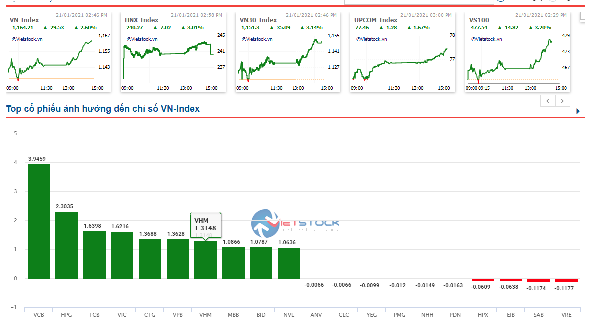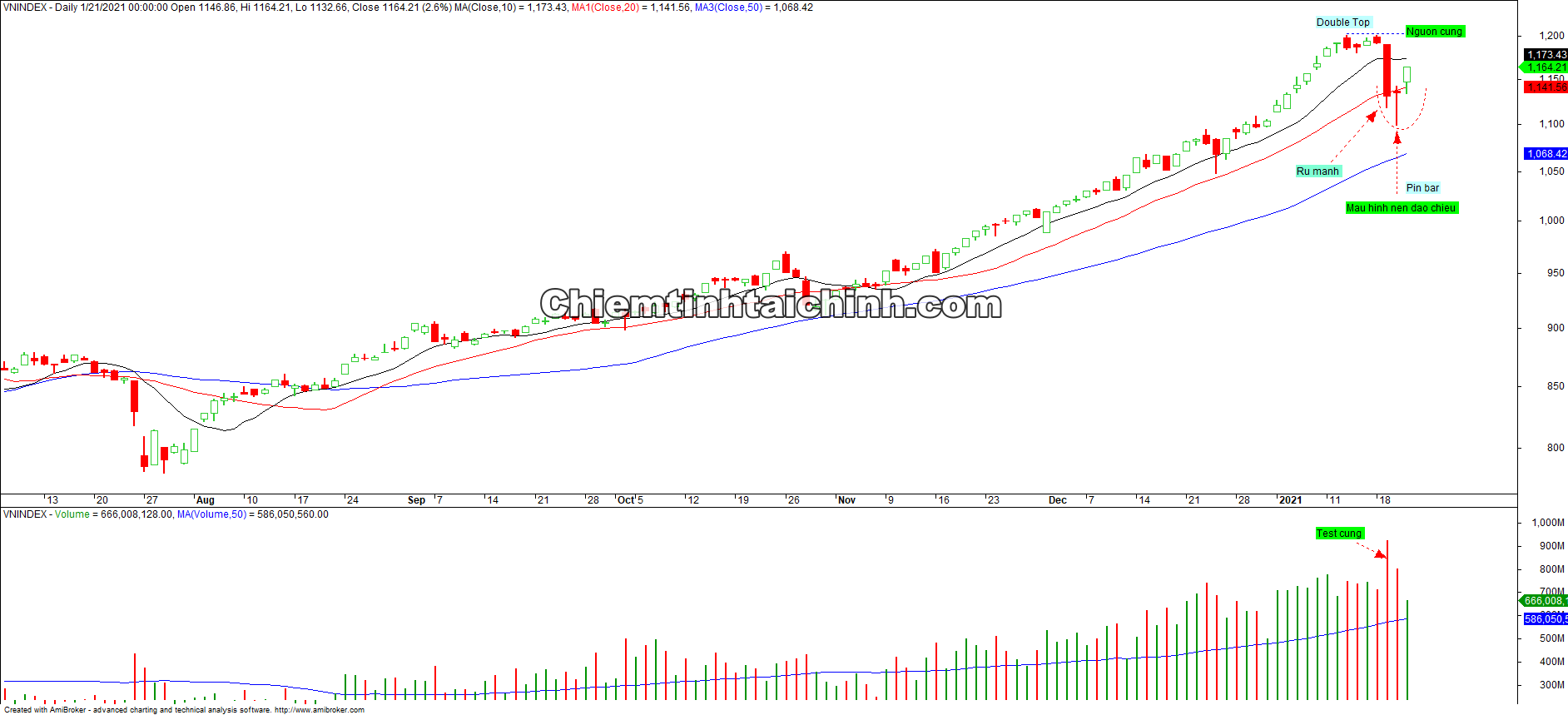 Kết thúc phiên giao dịch ngày 21.1.2021 chỉ số Vnindex đóng cửa ở mức 1164 điểm, tăng 29.53 điểm, tương tứng tăng hơn 2.6 %, khối lượng giao dịch đạt 666 triệu đơn vị. Lực cầu bắt đáy mạnh sau phiên tạo Pin Par vào ngày 20.1.2021. Nhiều cổ phiếu đã tăng trở lại sau khi kéo ngược về MA20 ngày hoặc MA50 ngày. Dòng ngân hàng phiên hôm nay đóng vai trò đầu kéo giúp thị trường tăng mạnh, trong đó có một số cổ phiếu như : VCB,TCB,CTG,BID,MBB. Bên cạnh đó là lực đẩy từ nhóm cổ phiếu VHM,NVL,