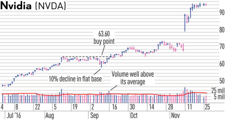 Nvida (NVDA) hình thành nền giá phẳng vào tháng 8 năm 2016, được phát hiện bởi dịch vụ MarketSmith Chart Analysis Took. Nền giá phẳng của NVDA có điểm breakout vào tháng 9/2016 và có chiều dài 5 tuần. Đỉnh cao nhất của nền giá là 63.50, cộng thêm 10cent ta có điểm mua hợp lý là 63.6. Trong tuần kết thúc ngày 23.9.2016, Nvidia có điểm breakout cao hơn điểm mua hợp lý với khối lượng lớn. Đối với bất cứ điểm breakout nào, khối lượng nên cao hơn ít nhất 40% so với thanh khoản bình quân.