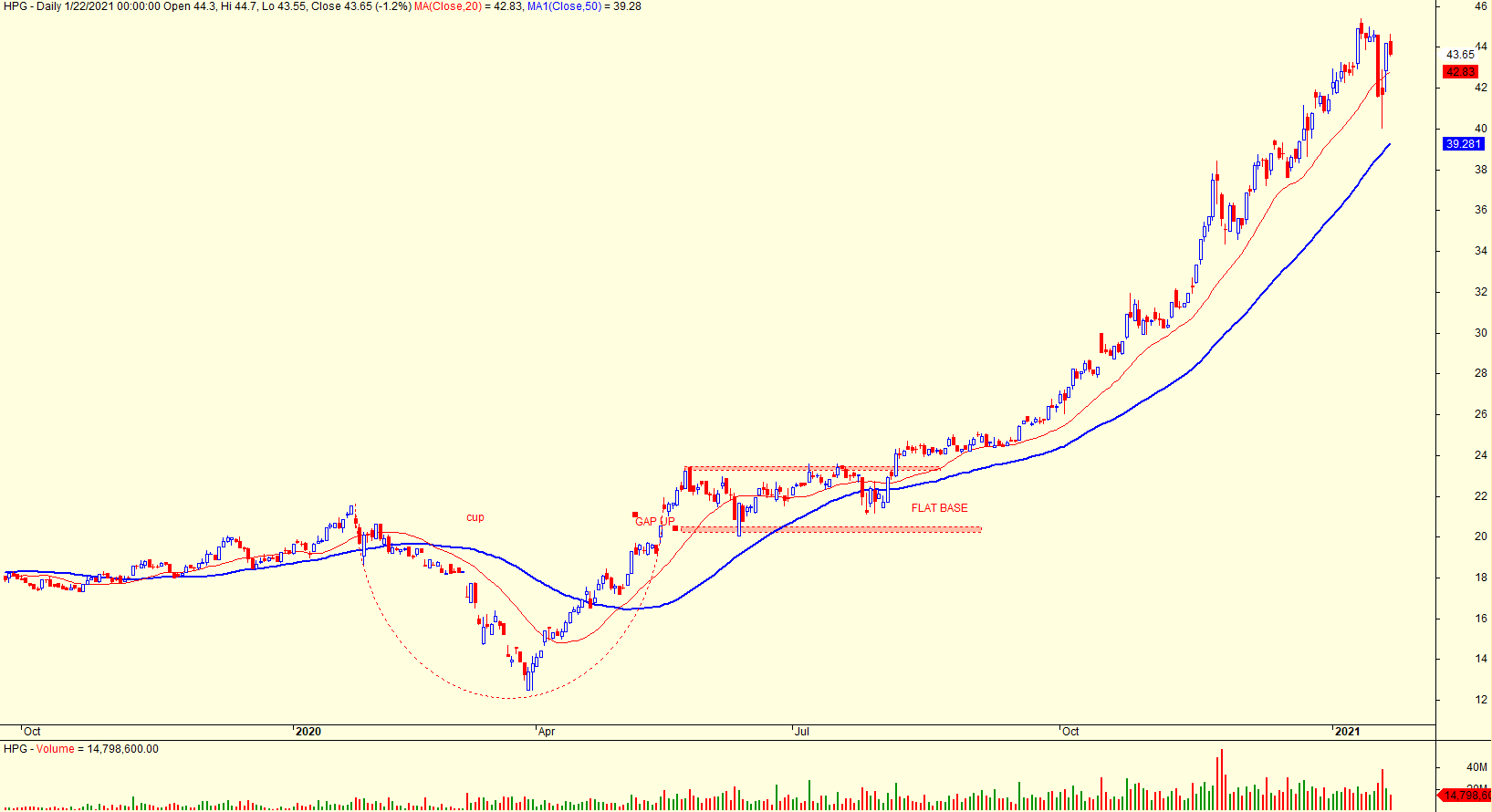 Vào mùa Covid 19, cổ phiếu HPG có cú tăng 90% từ đáy tháng 3.2020 để tạo nên mẫu hình chiếc cốc không có tay cầm. Cổ phiếu tạo điểm breakout bằng Gap Up, một điểm mua theo môn đệ O’Neil. Nhưng đó là lúc thị trường chung tạo đỉnh vào 6.6.2020 và trải qua đợt điều chỉnh bởi Covid lần hai. Sự suy yếu của thị trường chung dẫn tới sự hình thành Nền Giá Phẳng ở HPG. Điều này cho thấy cổ phiếu có áp lực tăng giá. Trong khi nhiều cổ phiếu điều chỉnh sâu thì HPG gần như đi ngang, thậm chí ngay cả Covid lần 2 cũng chỉ tạo cú sốc giá nhanh. Độ sâu của nền giá phẳng mà HPG hình thành chỉ 15%.