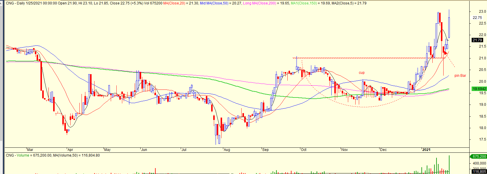 Cổ phiếu đang hình thành mẫu hình cốc (CUP) với điểm pivot tại 21. Cổ phiếu quay lại kiểm tra điểm pivot và đồng thời MA20 ngày bằng cây nến Pin Bar. Tín hiệu mua xuất hiện khi giá vượt qua trở lại đỉnh cây Pin Bar. Đây là nền giá đầu tiên của CNG.