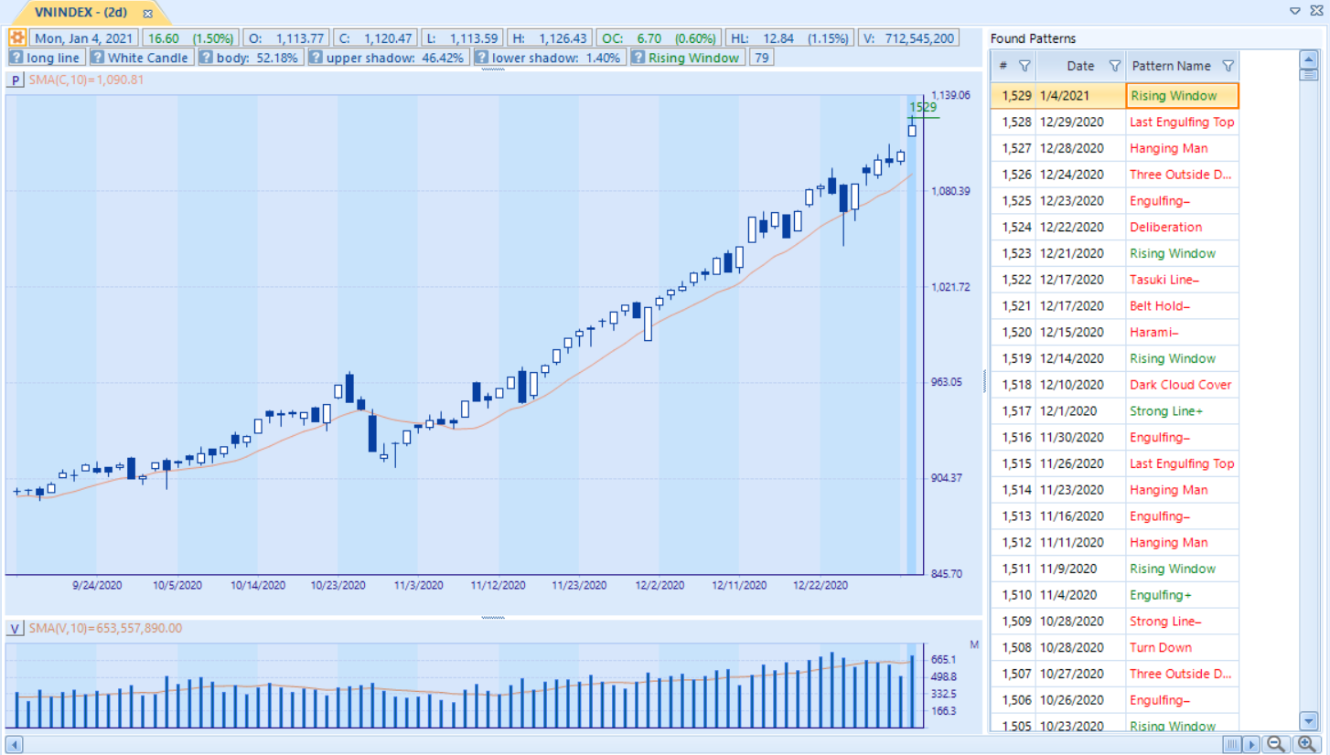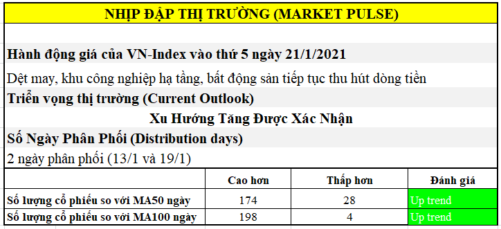Kết thúc phiên giao dịch ngày 25/1/2021, chỉ số Vnindex đóng cửa ở mức 1,166 điểm, giảm 0.73 điểm tương ứng giảm 0.006%. Thanh khoản thị trường đạt 666 triệu đơn vị thấp hơn phiên ngày 22/1/2021. Sự phân hóa thấy rõ ở trong các nhóm ngành khi bức màn lợi nhuận quý 4 và cả năm dần được hé lộ. Nhóm ngành cổ phiếu khu công nghiệp hạ tầng, bất động sản, dệt may, công nghệ thông tin đang là tâm điểm của thị trường. Một số cổ phiếu Bluchips cần theo dõi sát trong những phiên tới như: GAS,CTG,BID, VNM, VIC ….. Đây là nhóm cổ phiếu đang có giá nằm dưới MA20 thậm chí MA50 ngày ” Alexander Elder luôn luôn khuyến khích các trader theo dõi chỉ báo “Số Lượng Cổ Phiếu Nằm Trên Đường MA50 Ngày” (xem trang 191 sách “Phương Pháp Mới Để Giao Dịch Kiếm Sống”) để nhận diện xu hướng thị trường. Khi chỉ số thị trường tăng giá nhưng số lượng cổ phiếu nằm trên đường MA50 ngày giảm xuống, đó là tín hiệu cảnh báo xu hướng tăng của toàn bộ thị trường sắp kết thúc.