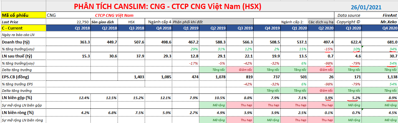Lũy kế cả năm 2020, CNG đạt 2,338 tỷ đồng doanh thu thuần, tăng 10% so với cùng kỳ, do giá vốn cũng tăng cao nên LNST đạt gần 50 tỷ đồng, giảm 40% so với năm 2019.