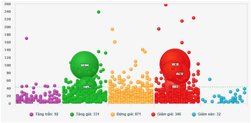 Số lượng cổ phiếu đứng giá đang chiếm ưu thế hơn 871 mã tham chiếu, trong khi số lương cổ phiếu giảm giá và tăng giá không chênh lệch nhiều, nhưng điều quan tâm là số lượng cổ phiếu giảm giá có góp mặt cửa một số cổ phiếu vốn hóa lớn: VCB,BID,ACV….