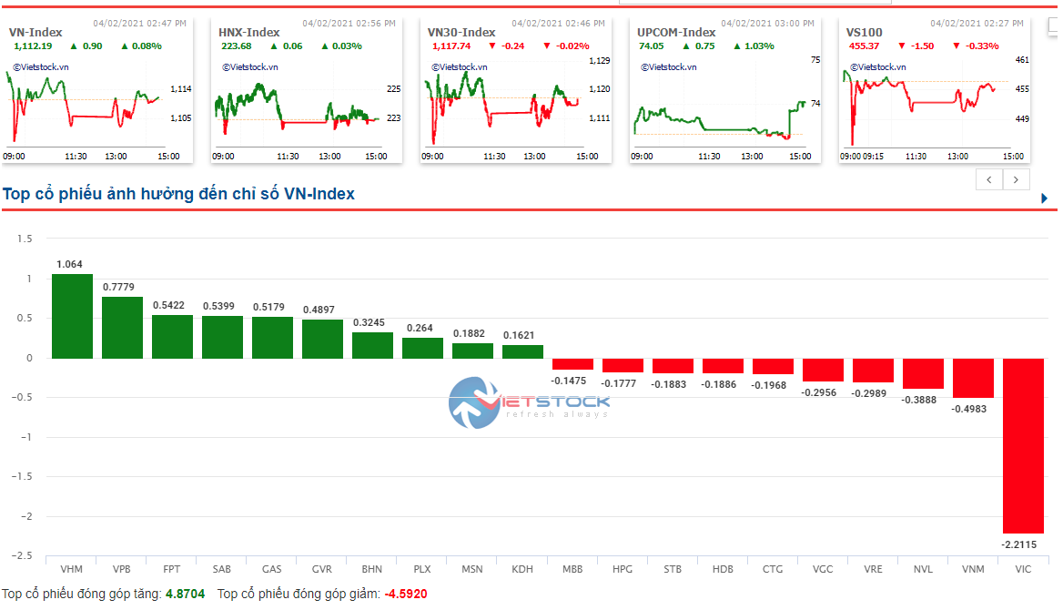 Kết thúc phiên giao dịch ngày 4/2/2021, chỉ số VNInex đóng cửa ở mức 1112.9 điểm, tăng nhẹ 0.9 điểm, tương ứng tăng 0.08%. Thanh khoản thị trường đạt 471 triệu đơn vị thấp hơn phiên ngày 3/2/2021. Tội đồ phiên hôm nay là cổ phiếu VIC khi đóng góp tới 2.2 điểm giảm. Trong khi ở phía tăng giá, những cổ phiếu lớn tạo nên ảnh hưởng tích cực không tập trung ở một nhóm ngành cụ thể mà phân hóa mạnh như: VHM, VPB FPT, BHN …. Tuy nhiên, đi chi tiết vào từng nhóm ngành và từng cổ phiếu, hiện tại dòng tiền đang tập trung ở một số ngành như: Công nghệ thông tin, khu công nghiệp hạ tầng bất động sản, bất động sản, điện .