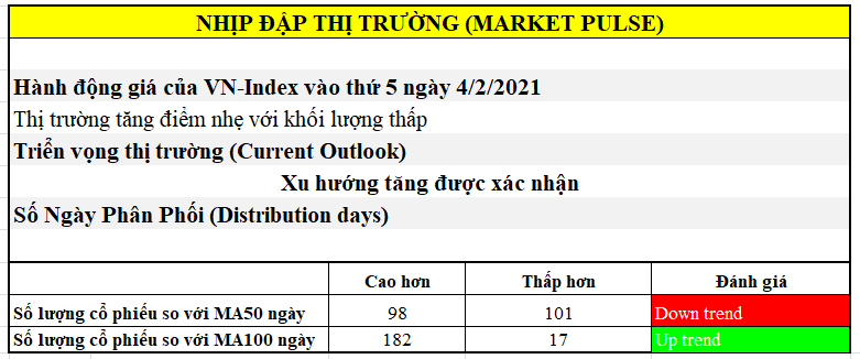 Thị trường vẫn đang ở ” Xu hướng tăng được xác nhận” khi xuất hiện ngày Bùng nổ theo đà (FTD) ngày 3/2/2021. Sau phiên bùng nổ theo đà, chúng ta vẫn đang tiếp tục theo dõi thị trường xem ngày “Bùng nổ theo đà” có thành công hay không? Thị trường phiên hôm nay tăng điểm với khối lượng thấp cho thấy nhiều nhà đầu tư đang quan sát xem những lực cầu bắt đáy trước đó được hấp thụ thế nào ? Hiện tại chỉ còn 3 ngày giao dịch nữa sẽ đến Tết và nghỉ hơn 8 ngày. Đây cũng là nguyên nhân khiến nhiều nhà đầu tư thận trọng nắm giữ cổ phiếu trong dịp Tết.