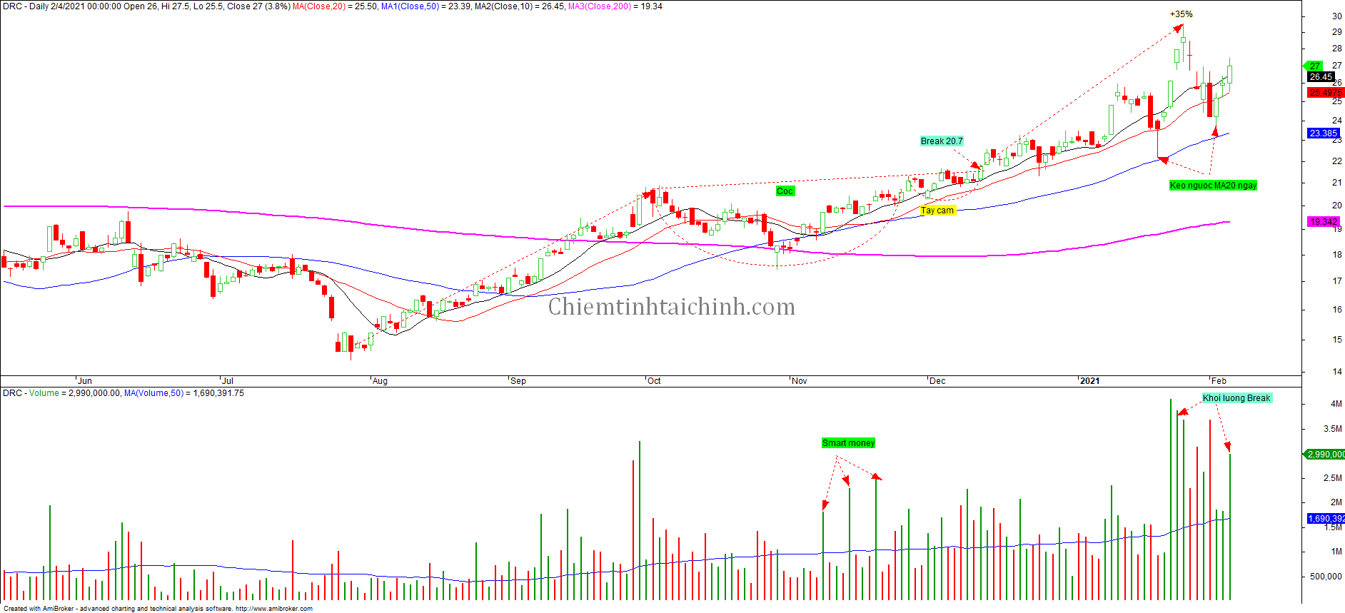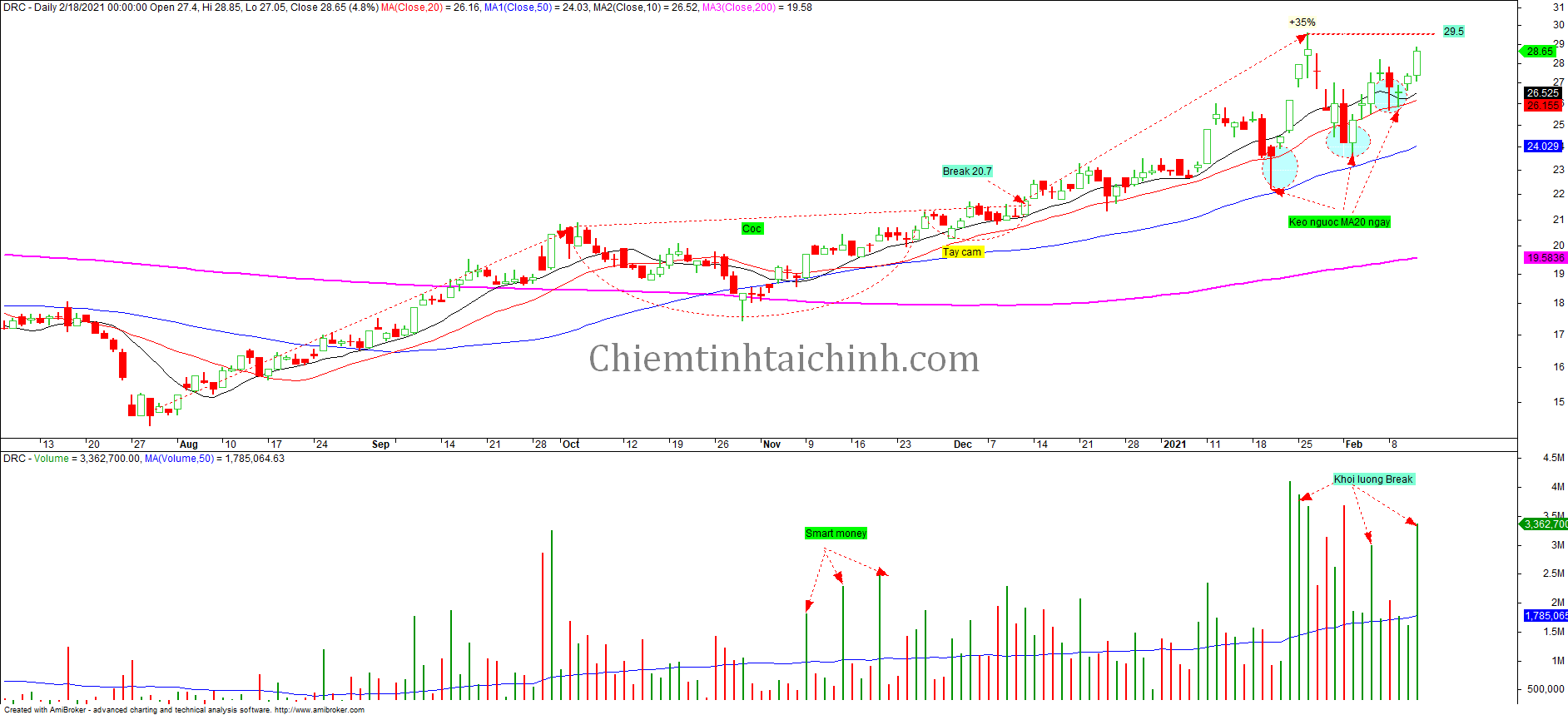 Trước biến động mạnh của thị trường, cổ phiếu DRC cũng đã có hành động giá kéo ngược và kiểm tra MA20 ngày trước đó. Hiện tại cổ phiếu đã bật tăng trở lại lên trên MA20 ngày với khối lượng lớn.