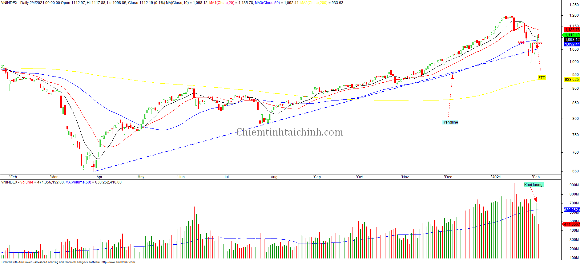 Hành động giá của VNIndex phiên ngày 4/2/2021 khá cân bằng giữ bên mua và bên bán, độ biến động của thị trường đang được thu hẹp đồng thời thanh khoản của thị trường đang thắt chặt trở lại . Như vậy sau phiên FTD thị trường chưa xuất hiện phiên phân phối nào, chúng tôi tiếp tục quan sát tiếp 2 đến 3 phiên tiếp để xem thị trường sẽ phản ứng thế nào với vùng MA 50 ngày, đồng thời lên danh sách những cổ phiếu Leader ở các nhóm ngành tiềm năng.