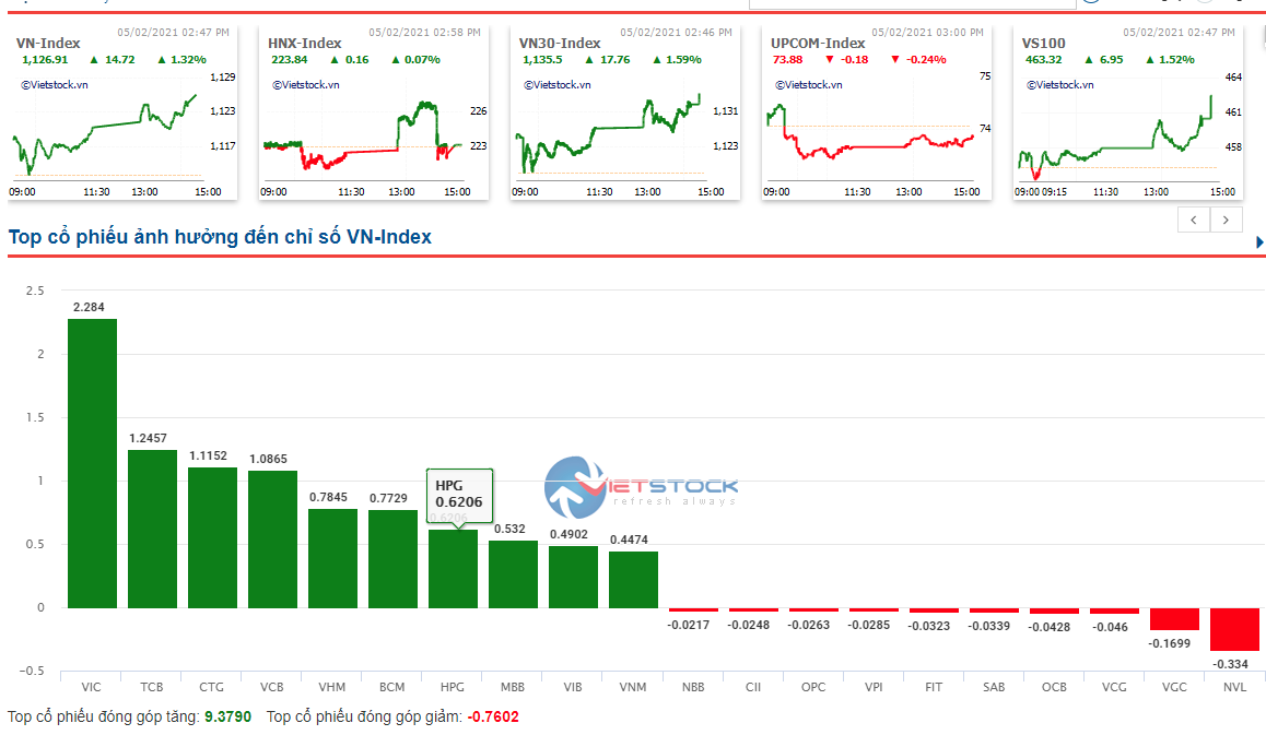 Kết thúc phiên giao dịch ngày 5/2/2021, chỉ số VNIndex đóng của ở 1126.91 điểm, tăng 14.72 điểm tương đương tăng 1.32%. Thanh khoản thị trường đạt hơn 458 triệu đơn vị và thấp hơn phiên ngày 4/2/2021. Thị trường phân hóa khá mạnh, nhóm VIN và nhóm ngân hàng vẫn đang là 2 nhóm ngành đang góp phần vào đà tăng điểm của thị trường như: VHM,VIC,CTG,VCB, TCB,MBB... Ngoài ra với sự lộ diện kết quả kinh doanh quý 4 và năm 2020 nhiều cổ phiếu trong cùng một nhóm ngành cũng phân hóa mạnh, tăng giảm trái ngược nhau. Sắp tới sẽ là mùa “Đại Hội Cổ Đông” để công bố kế hoạch – lợi nhuận năm 2021 sẽ có nhiều cổ phiếu sẽ tiếp tục tăng điểm. Đây cũng được xem là “Hướng dẫn lợi nhuận đến từ doanh nghiệp”. Có một số cổ phiếu đã công bố kế hoạch quý 1 năm 2021 hoặc cả năm 2021 như :DRC,FPT, GVR… đã có ảnh hưởng tích cực đến giá cổ phiếu.