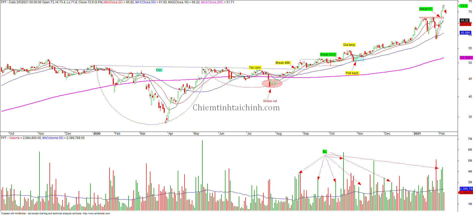 Cổ phiếu FPT như chúng tôi đã cập nhật ở bản tin [Nhịp đập thị trường 3/2/2021] Phiên bùng nổ theo đà (FTD) và mẫu hình đảo chiều Island Gap xuất hiện, nhiều cổ phiếu thiết lập đỉnh giá mới – Tiêu điểm FPT tiếp tục tăng điểm với khối lượng tăng mạnh. Tiếp tục đề phòng khả năng kéo ngược của cổ phiếu sau khi kéo ngược về MA50 ngày trước đó. Đồng thời lên chiến lược gia tăng FPT khi cổ phiếu kéo ngược MA10 ngày cùng với nhịp thị trường đang tích lũy. Cổ phiếu đang có mức cao RS = 87.