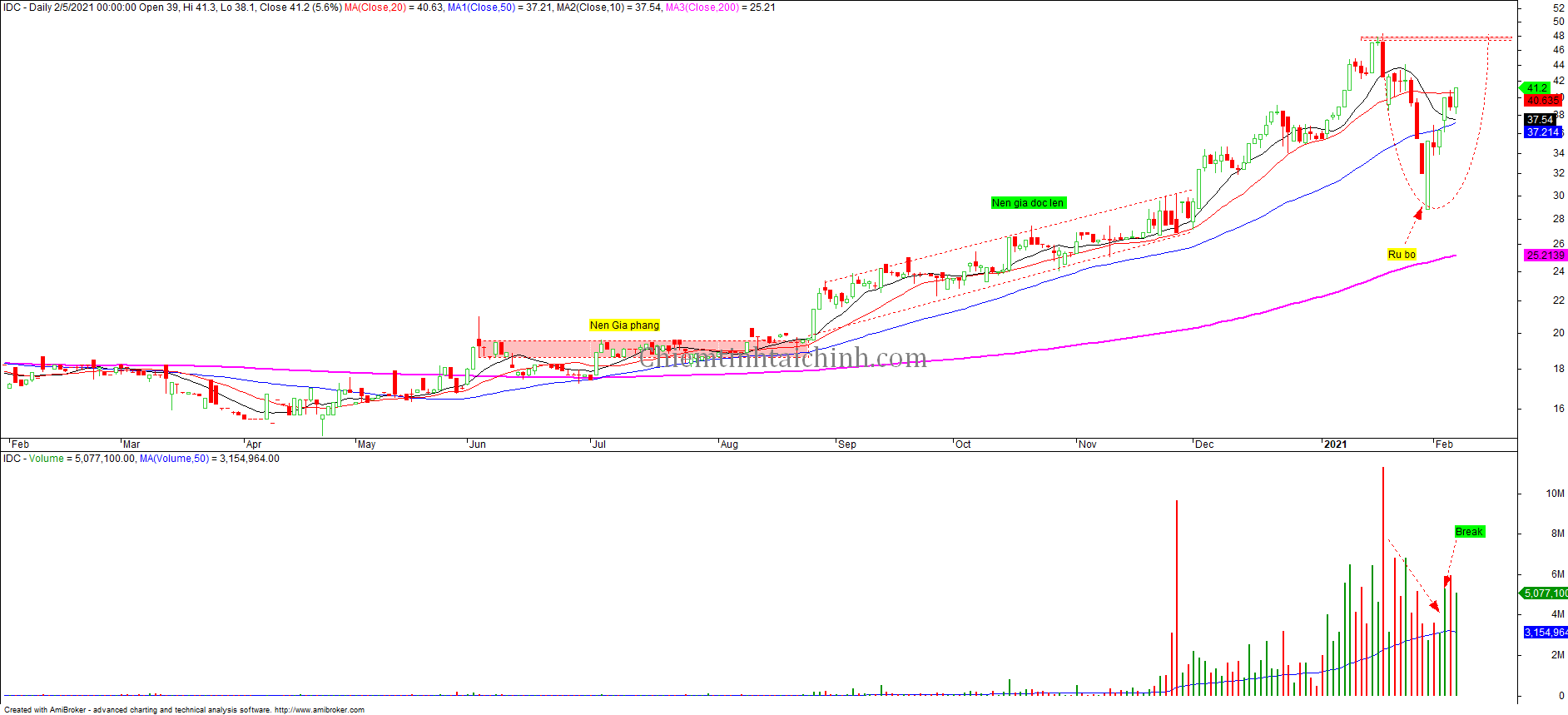 Cổ phiếu IDC thuộc nhóm ngành “Khu công nghiệp hạ tầng bất động sản” đang có sức mạnh giá cao. Bản thân cổ phiếu đang có mức RS cao ở mức 90. Cổ phiếu sau khi kéo ngược MA50 ngày và hồi phục, cổ phiếu đang tiến về vùng đỉnh cũ 48. Chúng tôi đang quan sát mẫu hình “Cốc tay cầm” của cổ phiếu IDC. Phần cốc bên tay phải là những phiên tăng giá mạnh đi kèm khối lượng cao hơn thanh khoản bình quân 50 phiên là một dấu hiệu tốt cho thấy smart money đang nhập cuộc.