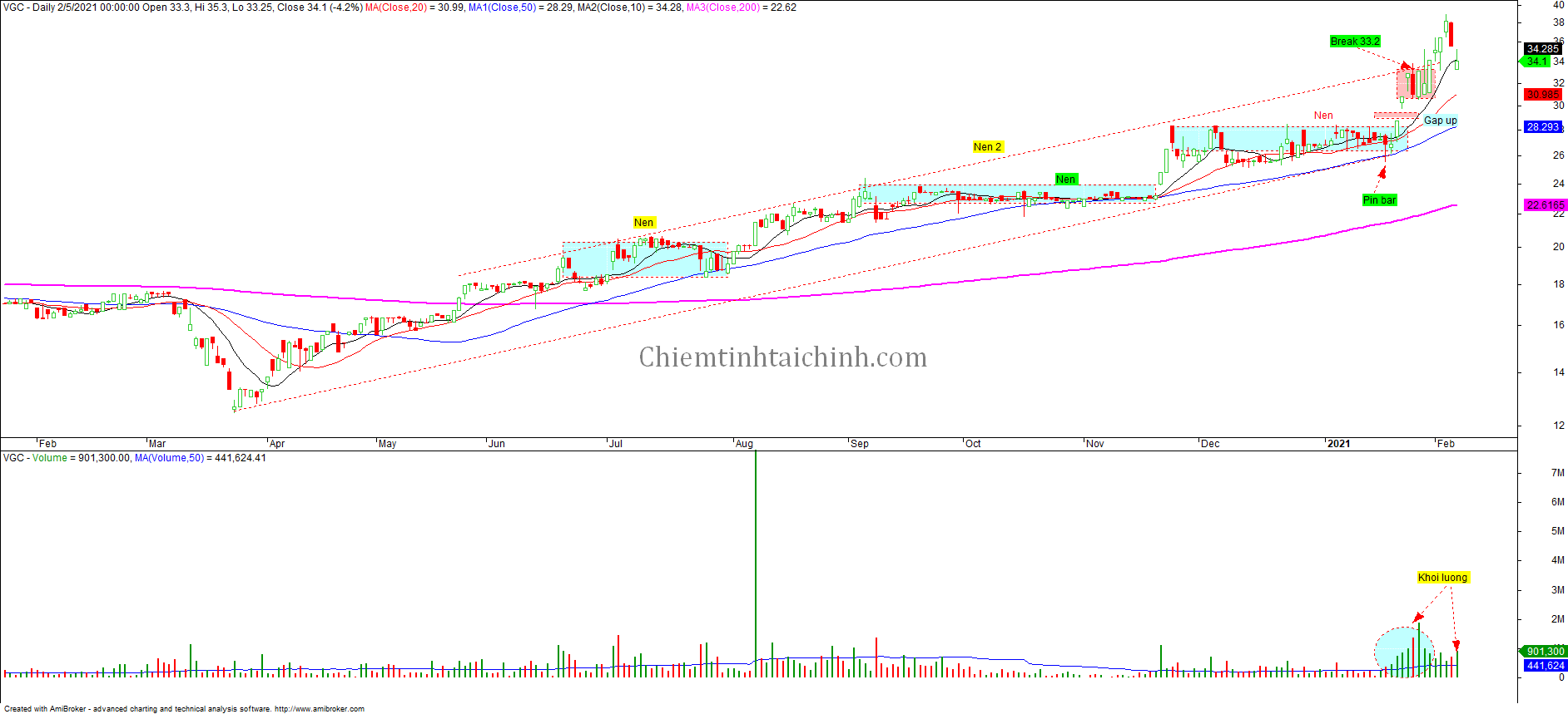 Cổ phiếu VGC đang có mức RS cao là 90. Hành động giá của cổ phiếu đang kéo ngược MA10 ngày với hành động khối lượng tăng mạnh trên bình quân 50 phiên. Đây là vùng bổ sung vị thế đối với VGC sau khi cổ phiếu đã Break khỏi nền giá dốc lên ở vùng 33.2 . Xem chi tiết bài viết trước về VGC:[Nhịp đập thị trường 28/1/2021] Áp lực bán mạnh trắng bên bán, màu xanh lơ là màu chủ đạo, đèn đỏ được bật- Tiêu điểm cổ phiếu VGC, AGG hoặc đề xuất nắm giữ VGC ngay trong downtrend của market chung.