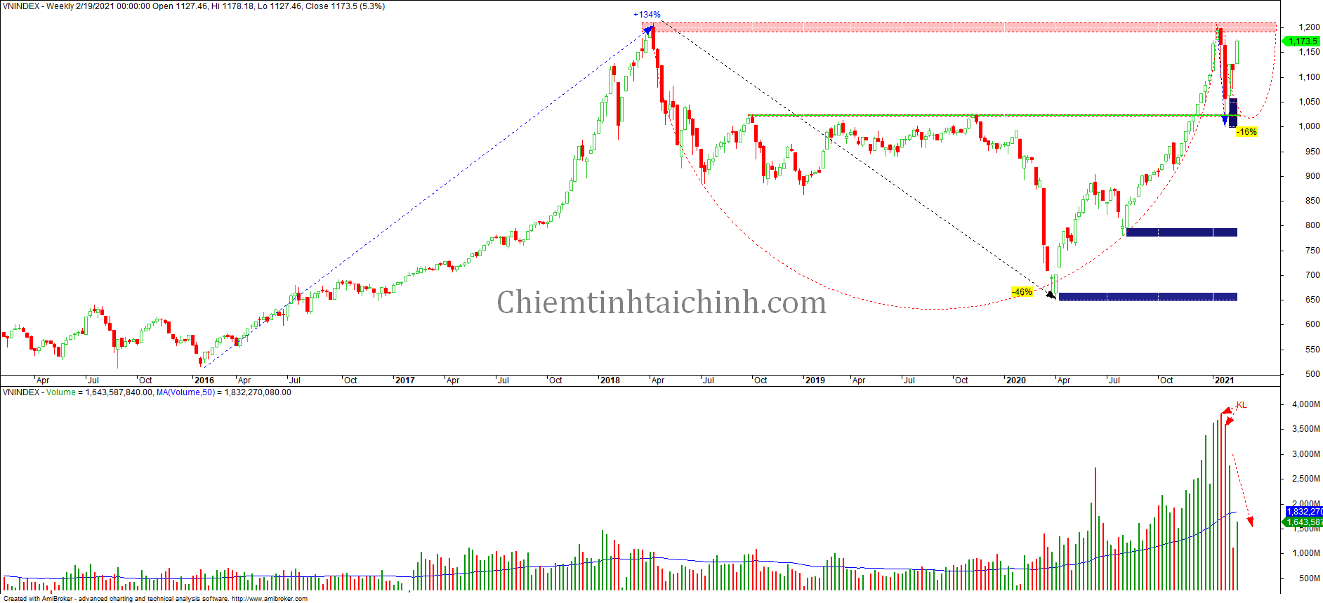 Trên đồ thị tuần, chỉ số VNIndex đang có nguồn cung ở vùng 1200 điểm. Chúng tôi đang quan sát độ biến động của chỉ số VNIndex : Hiện tại chỉ số VNIndex đang có 2 lần độ biến động thu hẹp lần lượt -46%, -16%.Nếu chỉ số tiếp tục thu hẹp thêm 1 hoặc 2 lần nữa với biên độ thắt chặt sẽ cũng cố hơn mẫu hình VCP tuy nhiên điều nhà đầu tư cần chú ý là lượng cung ở vùng 1200 điểm khá lớn. Hai tuần giảm điểm trước đó thị trường đạt mức thanh khoản hơn 3.5 triệu đơn vị mỗi tuần, thị trường cần thêm thời gian để hấp thu hết lượng cung này.
